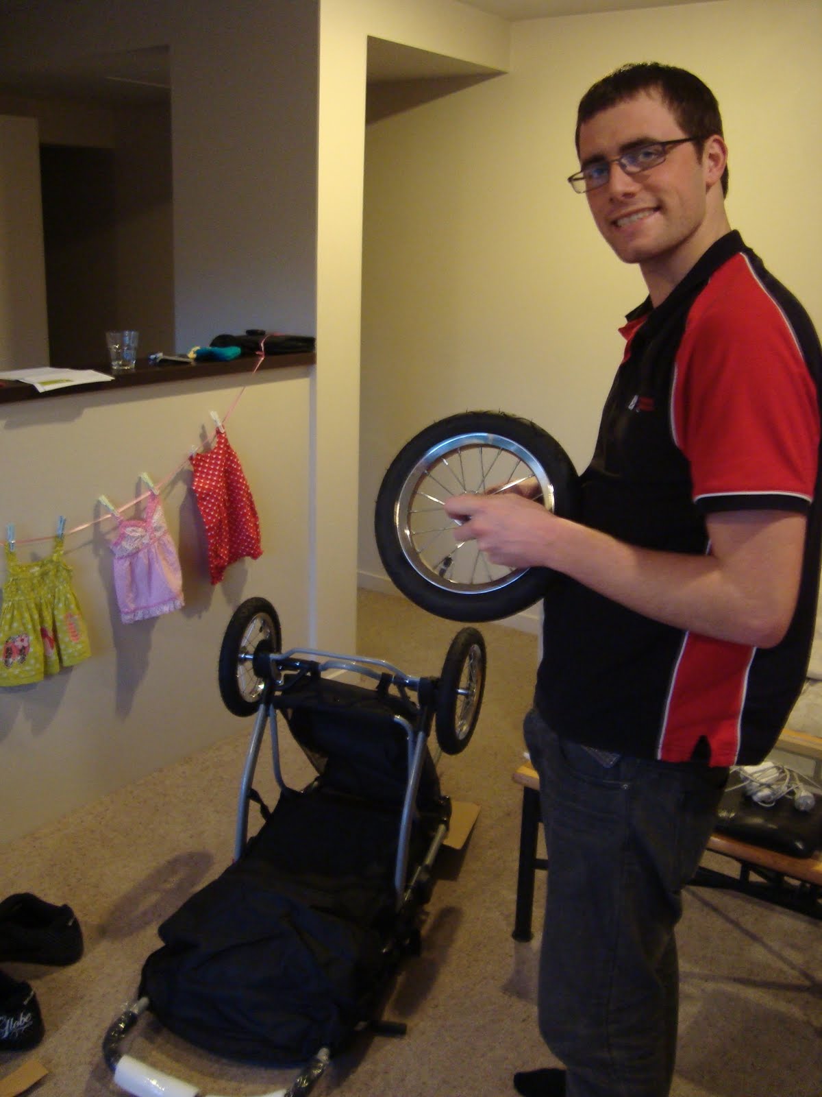 We bought Camillas buggy this week! A 3 wheel Jolly Jumper one in a fashionable black and red to match Graemes work uniform!